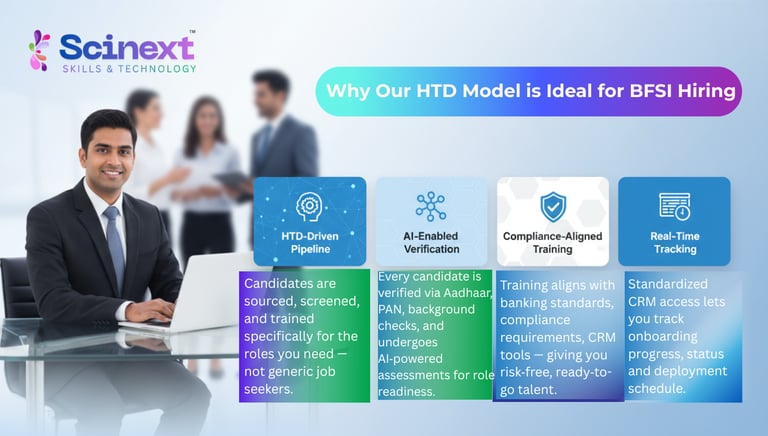 At Scinext Skills, we specialize in delivering job-ready, performance-driven manpower solutions for the BFSI sector through our powerful HTD (Hire – Train – Deploy) Model.